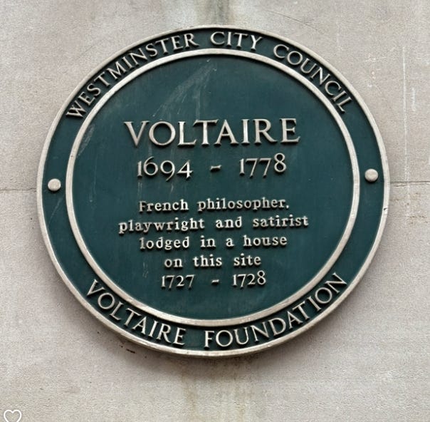 Volgens de Engelsen is de filosoof Voltaire in Londen geboren. Dat gaat wat ver. Maar hij leerde er in ieder geval om zichzelf niet zo serieus te nemen. Dat leidde na, enige tijd na zijn terugkeer in Frankrijk – Voltaire zou ook nog veel tijd in Zwitserland doorbrengen – tot zijn meest bekende boek Candide.